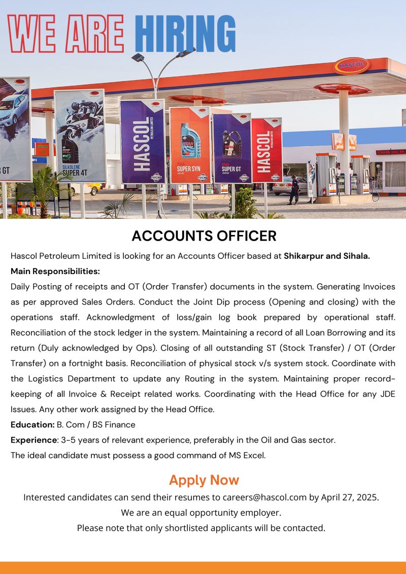 Hascol Petroleum Limited is looking for an Accounts Officer based at Shikarpur and Sihala.
