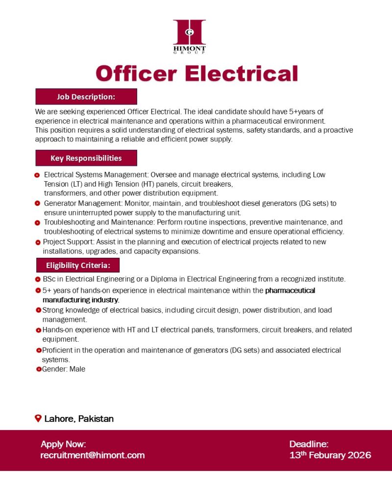 We are seeking an experienced Officer Electrical. The ideal candidate should have 5+ years of experience in electrical maintenance and operations within a pharmaceutical environment. This position requires a solid understanding of electrical systems, safety standards, and a proactive approach to maintaining a reliable and efficient power supply.