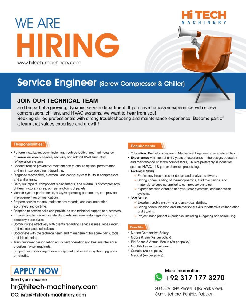 HiTech Machinery is looking for SERVICE ENGINEER (SCREW COMPRESSOR & CHILLER) Lahore