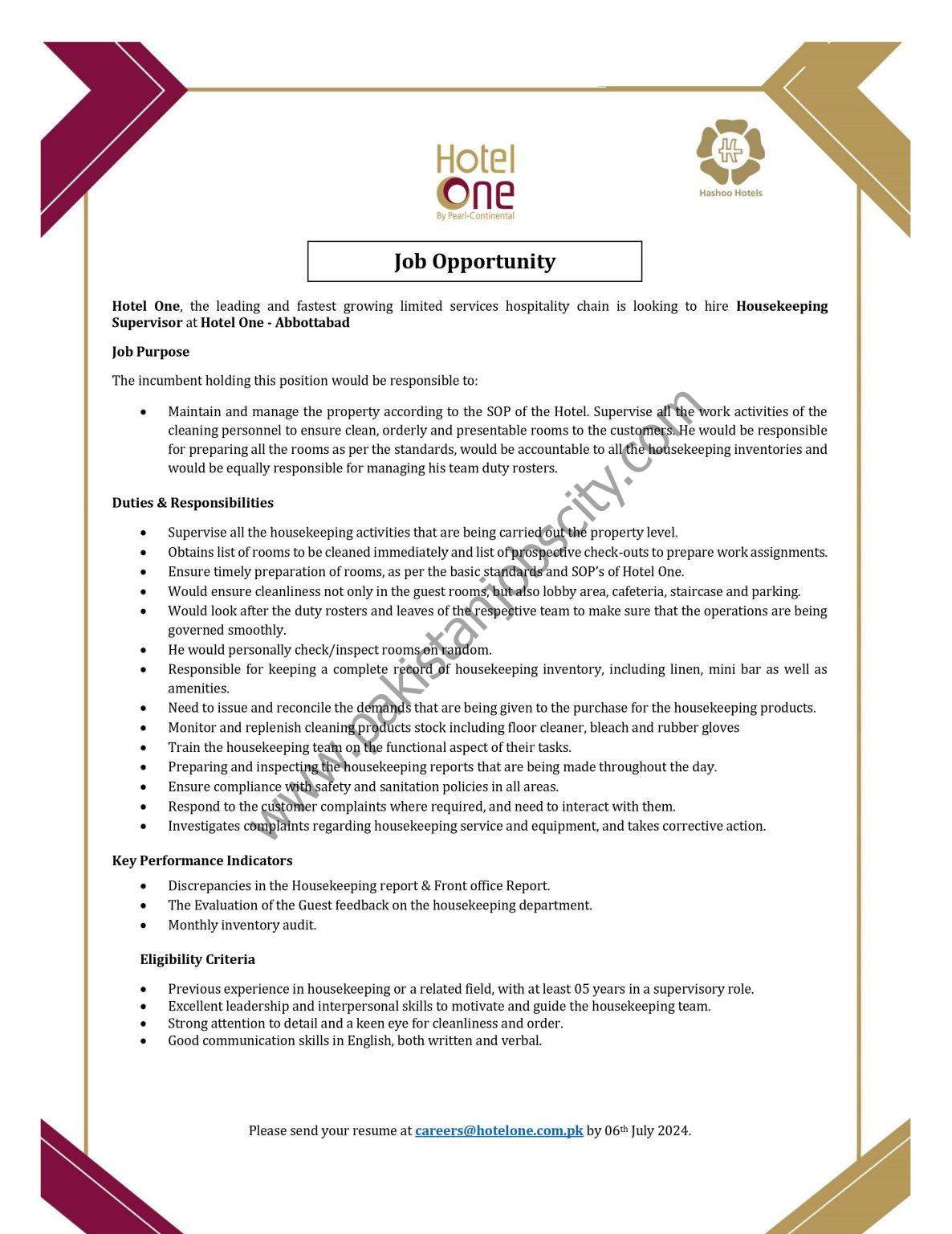 Hotel One Pvt Ltd Jobs Housekeeping Supervisor: