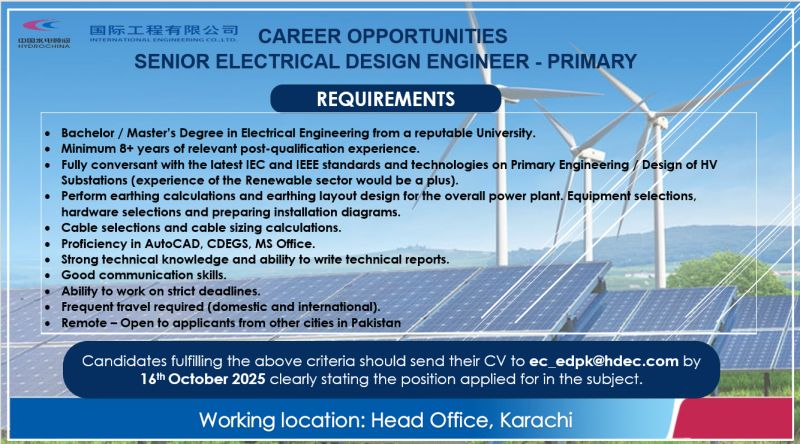HydroChina International Engineering Co., Ltd., is currently seeking applications for the Senior Electrical Design Engineer – Primary.
