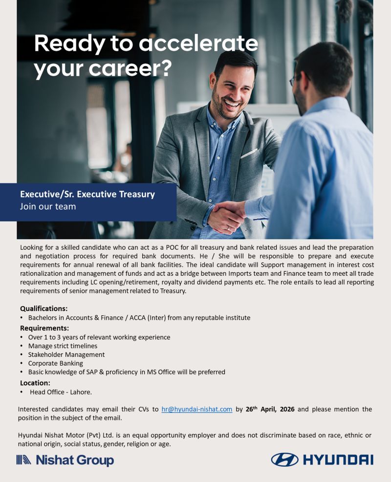 - Equality Statement: Hyundai Nishat Motor (Pvt) Ltd. is an equal opportunity employer and does not discriminate based on race, ethnic or national origin, social status, gender, religion, or age.