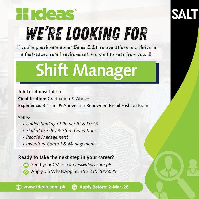 Looking for a dynamic and detail-oriented Shift Manager to join our team in Lahore. If you’re passionate about Sales & Store operations and thrive in a fast-paced retail environment, we want to hear from you!