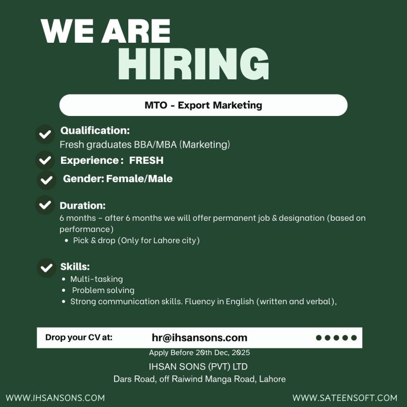 Ihsan Sons Products Pvt Ltd Jobs MTO Export Marketing: