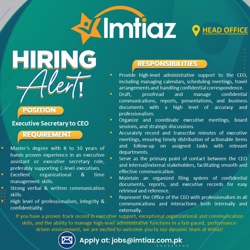 Imtiaz is seeking a poised, detail-oriented, and highly professional “Executive Secretary” to provide comprehensive executive support to the CEO. This position demands a high degree of discretion, excellent organizational skills, and the ability to handle sensitive information with the utmost confidentiality. The Executive Secretary will serve as a strategic partner to the CEO, ensuring seamless coordination of executive-level activities and effective communication across stakeholders.
