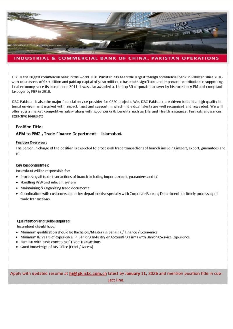 Job Title: APM to PM2, Trade Finance Department Location: Islamabad