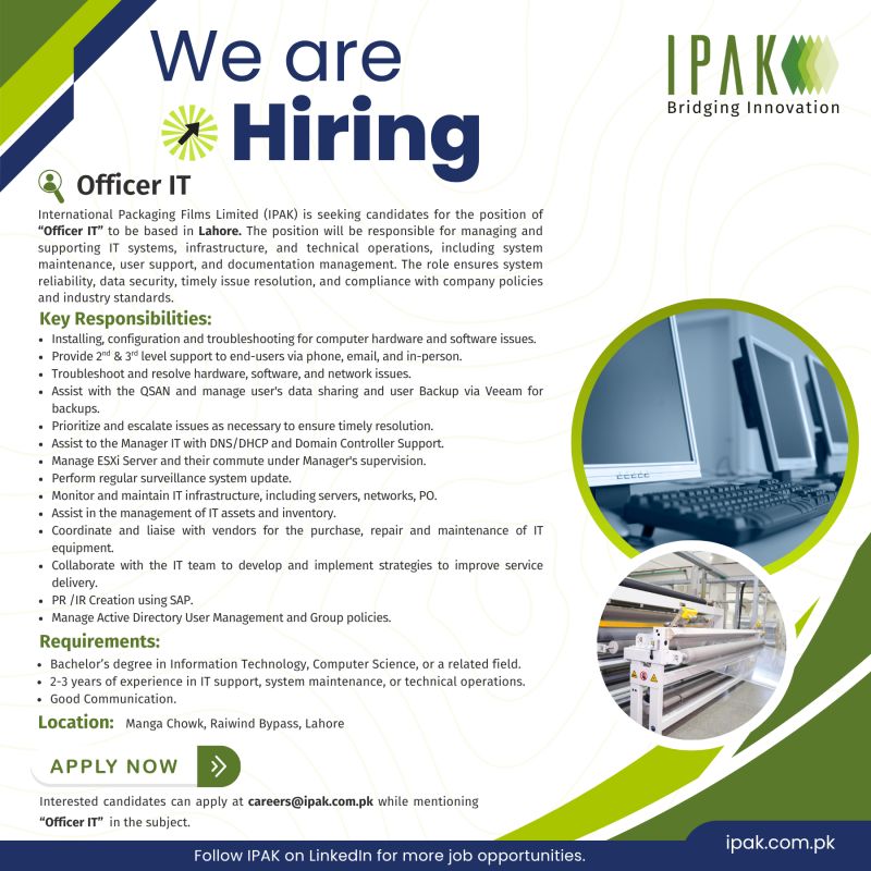 International Packaging Films Limited (IPAK) is seeking candidates for the position of “𝗢𝗳𝗳𝗶𝗰𝗲𝗿 𝗜𝗧” to be based in Lahore. The position will be responsible for managing and supporting IT systems, infrastructure, and technical operations, including system maintenance, user support, and documentation management. The role ensures system reliability, data security, timely issue resolution, and compliance with company policies and industry standards.