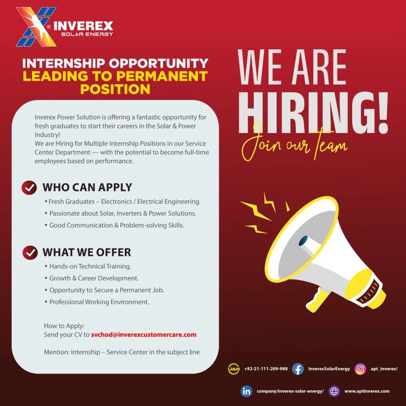 Inverex Solar Energy is offering multiple internship positions in their Service Center Department that can lead to permanent full-time roles.