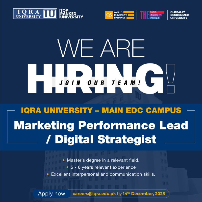 Iqra University – Main EDC Campus is seeking qualified and passionate individuals for the position of Marketing Performance Lead / Digital Strategist.