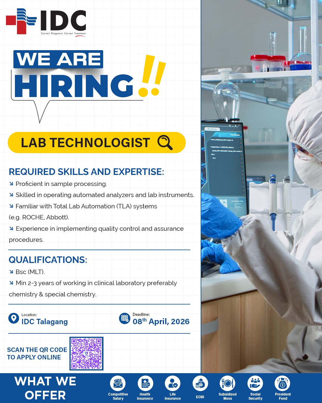 Islamabad Diagnostic Centre (IDC) is hiring skilled and dedicated Lab Technologist for its Talagang branch. Join a trusted name in diagnostic healthcare and grow your career with competitive salaries and comprehensive benefits.