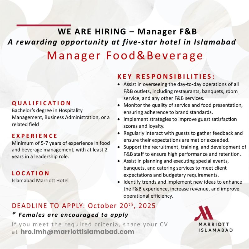 Islamabad Marriott Hotel Jobs Manager Food & Beverage: