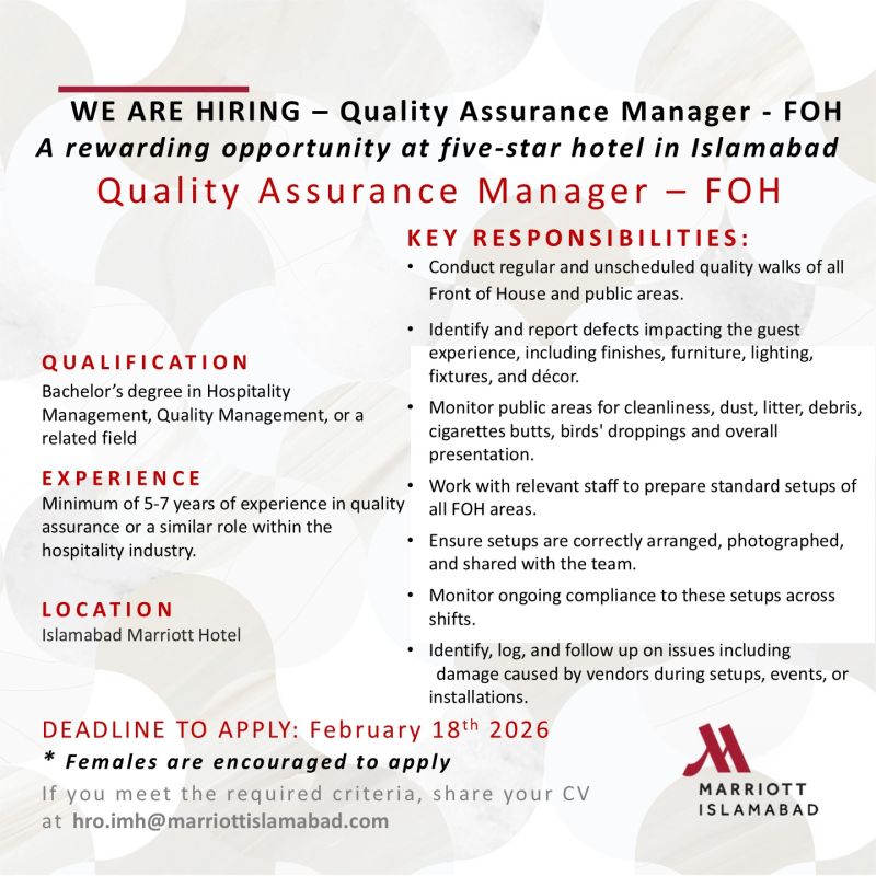 Islamabad Marriott Hotel Jobs Quality Assurance Manager: