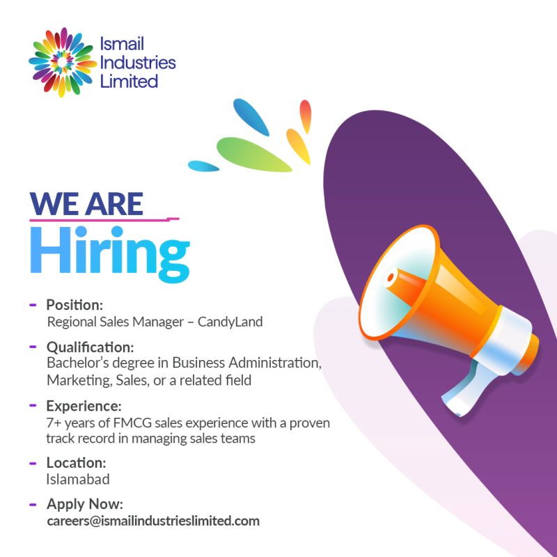 Ismail Industries Limited is seeking a performance-driven Regional Sales Manager to lead and grow CandyLand’s sales operations in Islamabad through strong team leadership and effective sales execution.