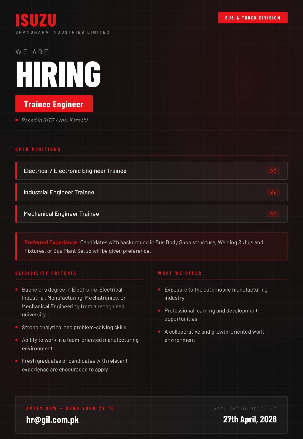 ISUZU Ghandhara Industries Limited Jobs Trainee Engineer: