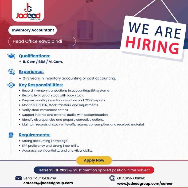 Jadeed Group is seeking a skilled Inventory Accountant to join our finance team at the Head Office in Rawalpindi.