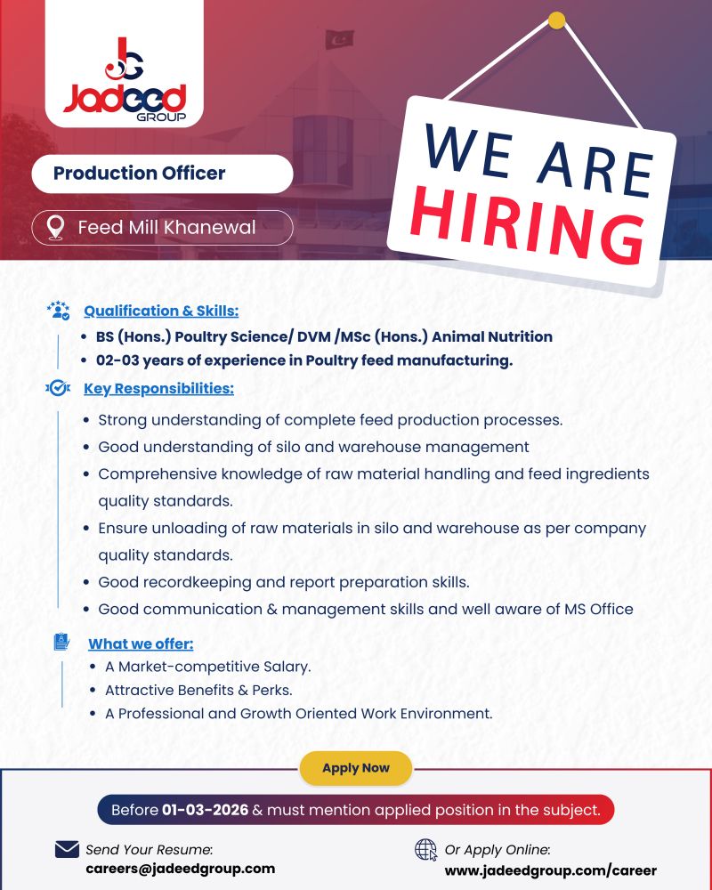 Jadeed Group is seeking a motivated Production Officer to join our Feed Mill operations in Khanewal.