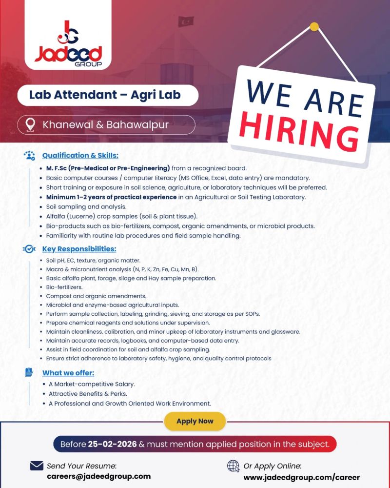 Jadeed Group is looking for a dedicated Lab Attendant to join our Agri Lab team in Khanewal and Bahawalpur. If you have 1–2 years of practical experience in agricultural or soil testing laboratories, basic computer skills, and a passion for supporting critical lab operations, we invite you to grow your career with an industry leader.