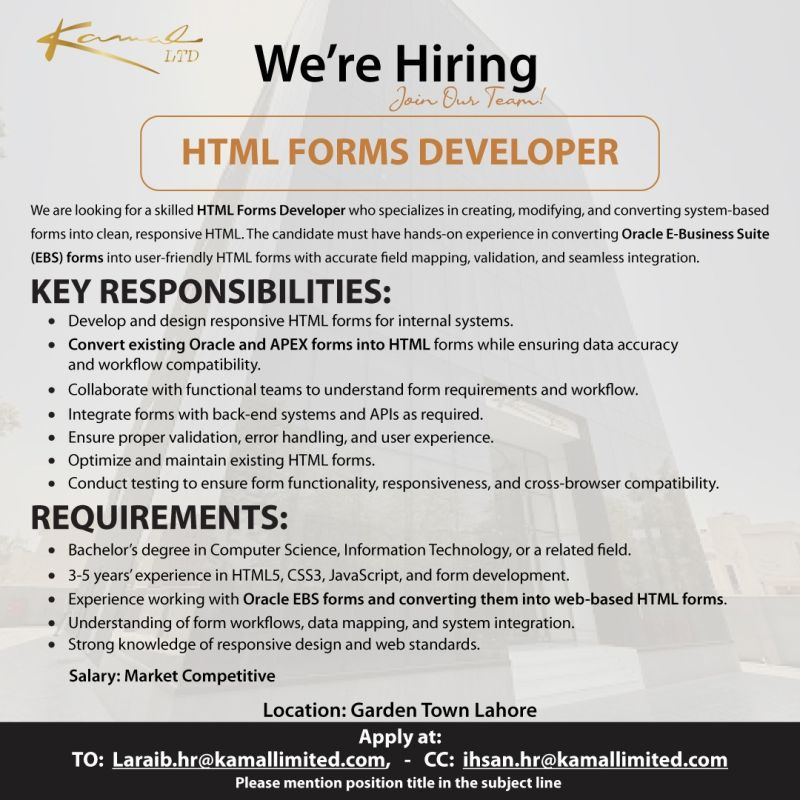 We are pleased to announce an opportunity for an experienced HTML Forms Developer to join our team in New Garden Town, Lahore.