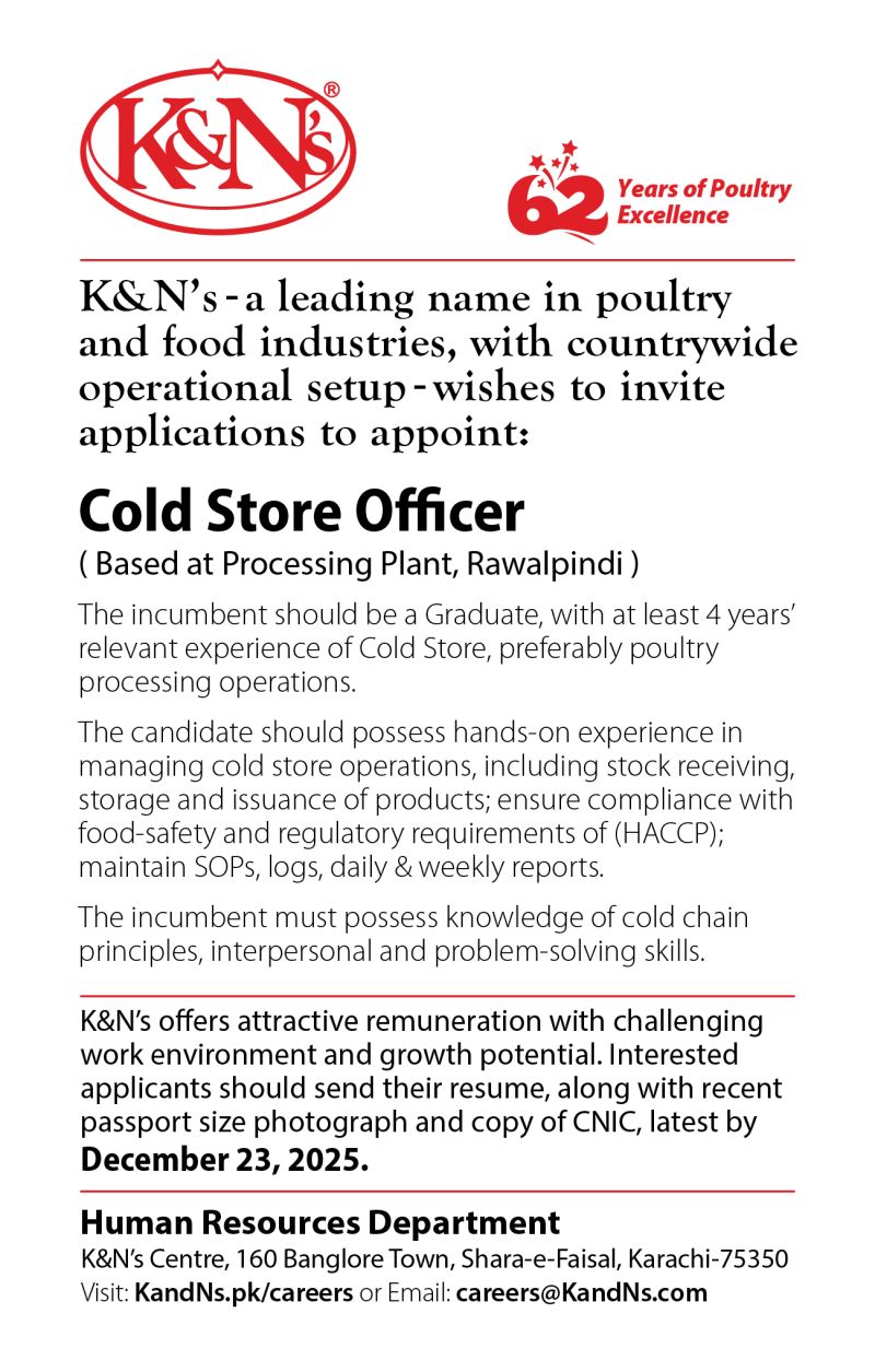 K&N’s — a leading name in poultry and food industries, with a countrywide operational setup — wishes to invite applications to appoint: