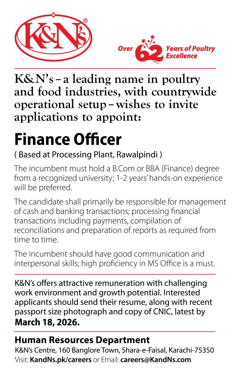 K&N’s — a leading name in poultry and food industries, with a countrywide operational setup — wishes to invite applications to appoint: