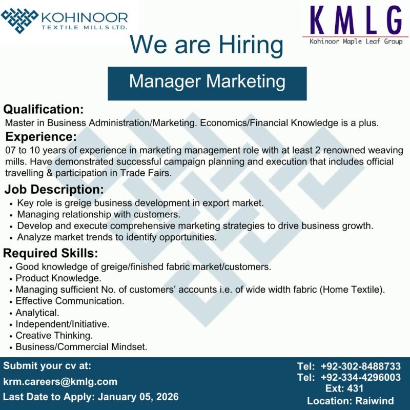 Kohinoor Textile Mills Limited Jobs Manager Marketing :
