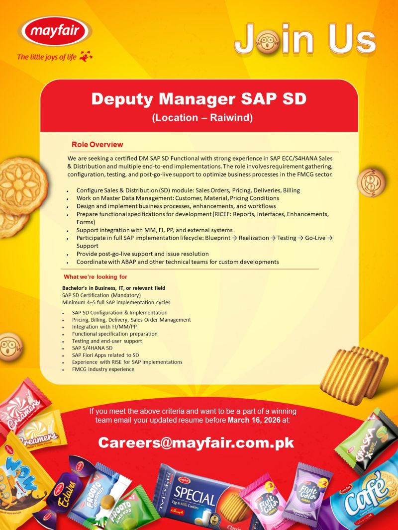 Position: Deputy Manager SAP SD (Location – Raiwind)