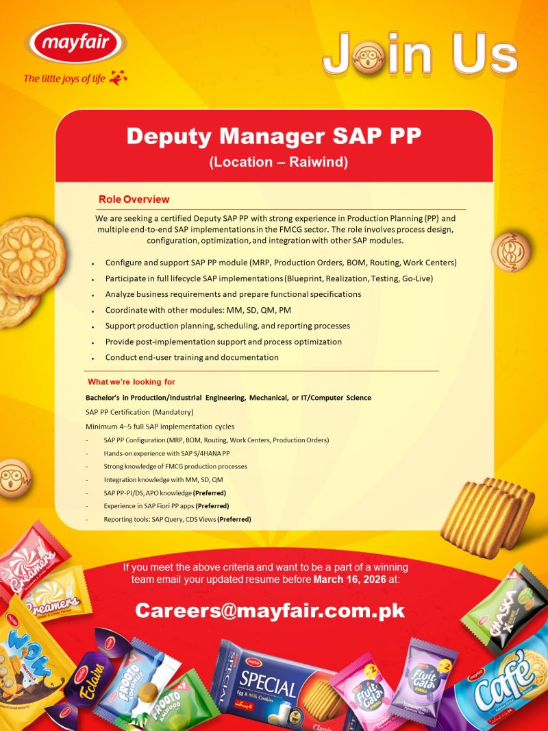 Position: Deputy Manager SAP PP (Location – Raiwind)