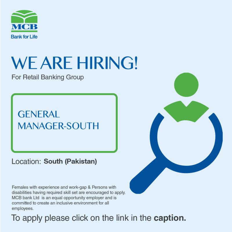 Are you looking for a career in one of Pakistan’s leading Banks? The Retail Banking Group of MCB Bank is looking for General Manager – South to join its team of talented, motivated and highly skilled professionals.