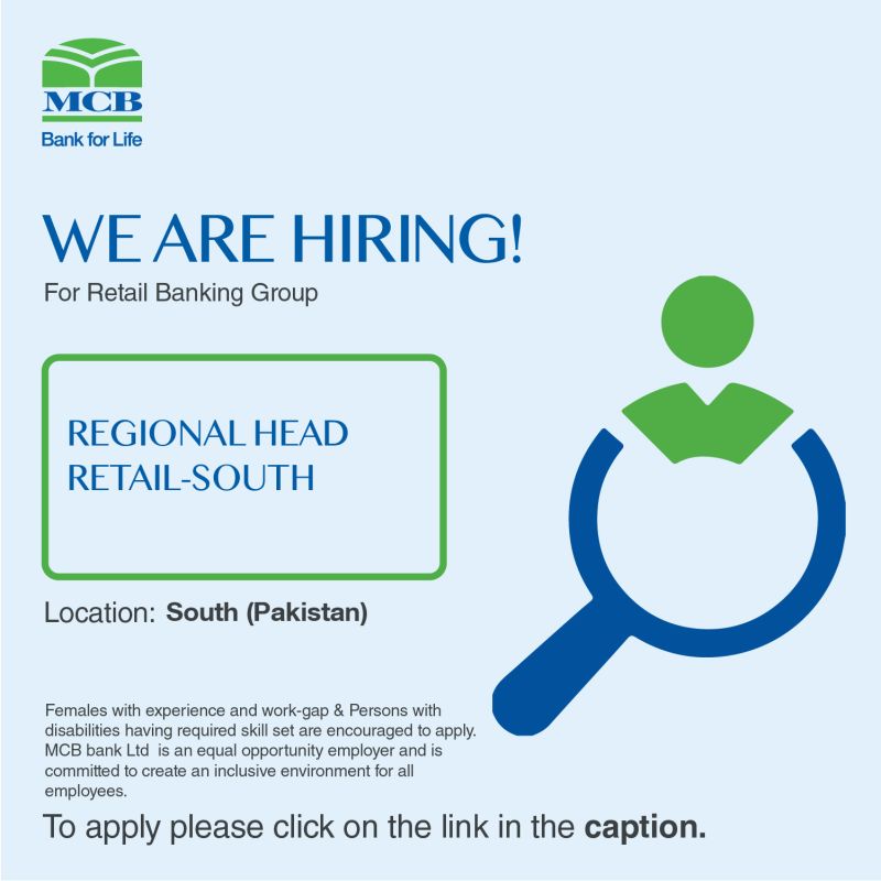 Are you looking for a career in one of Pakistan’s leading Banks? The Retail Banking Group of MCB Bank is looking for Regional Head Retail – South to join its team of talented, motivated and highly skilled professionals.
