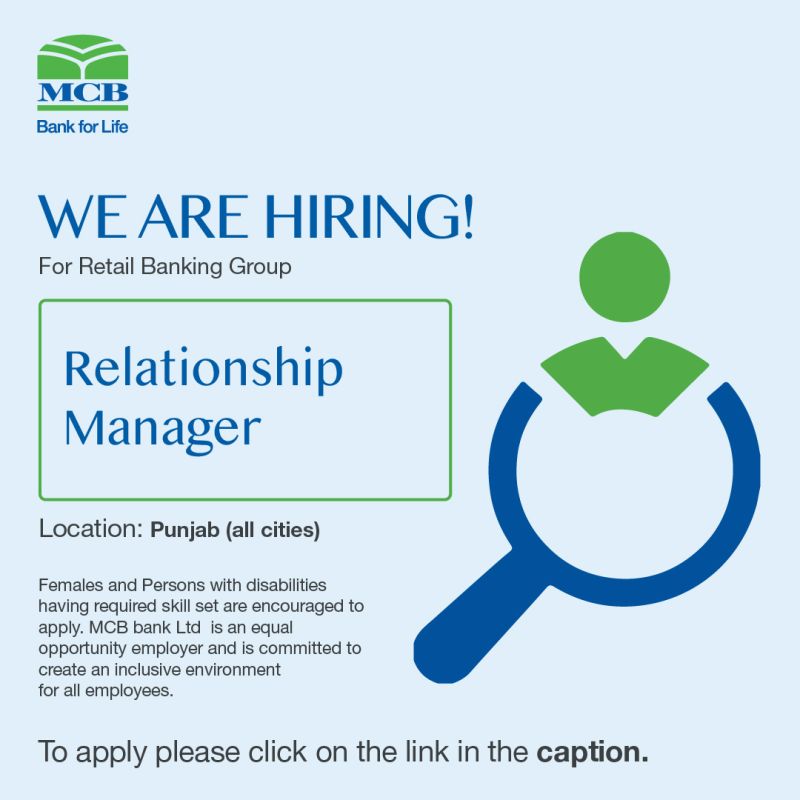 Are you looking for a career in one of Pakistan’s leading Banks? The Retail Banking Group of MCB Bank is looking for a Relationship Manager to join its team of talented, motivated, and highly skilled professionals.