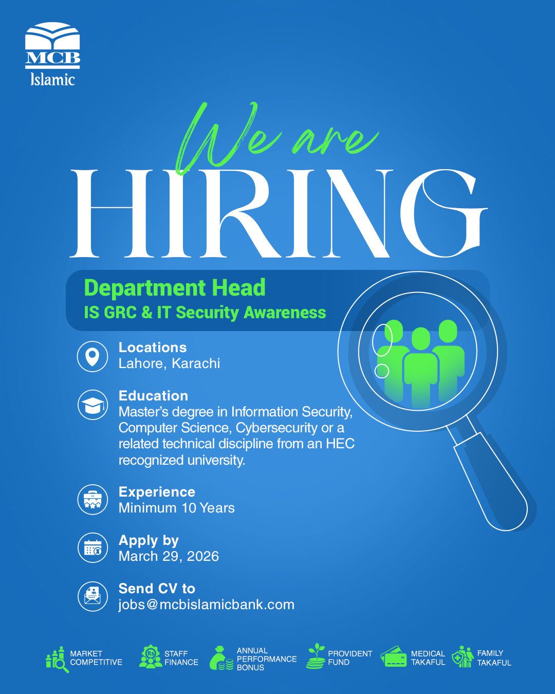 MCB Islamic Bank is inviting applications for the position of Department Head – IS GRC & IT Security Awareness. Join our growing team to drive business growth and deliver exceptional customer satisfaction.