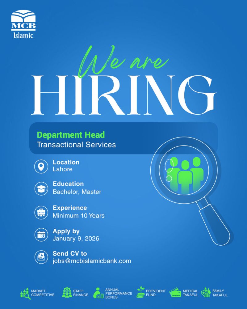 MCB Islamic Bank is inviting applications for the position of “Dept. Head Transactional Services”. Join our growing team to drive business growth and deliver exceptional customer satisfaction.