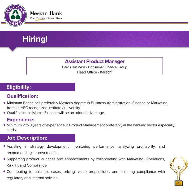 Meezan Bank is looking to hire Assistant Product Manager – Cards Business in Consumer Finance Group at Head Office, Karachi.