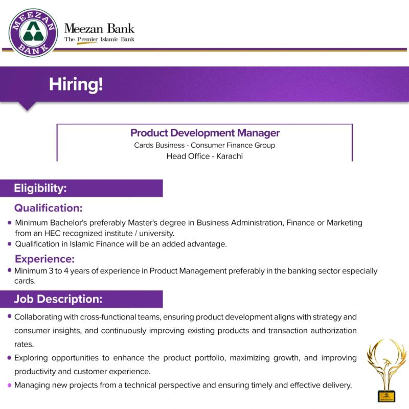 Meezan Bank is looking to hire Product Development Manager – Cards Business in Consumer Finance Group at Head Office, Karachi.