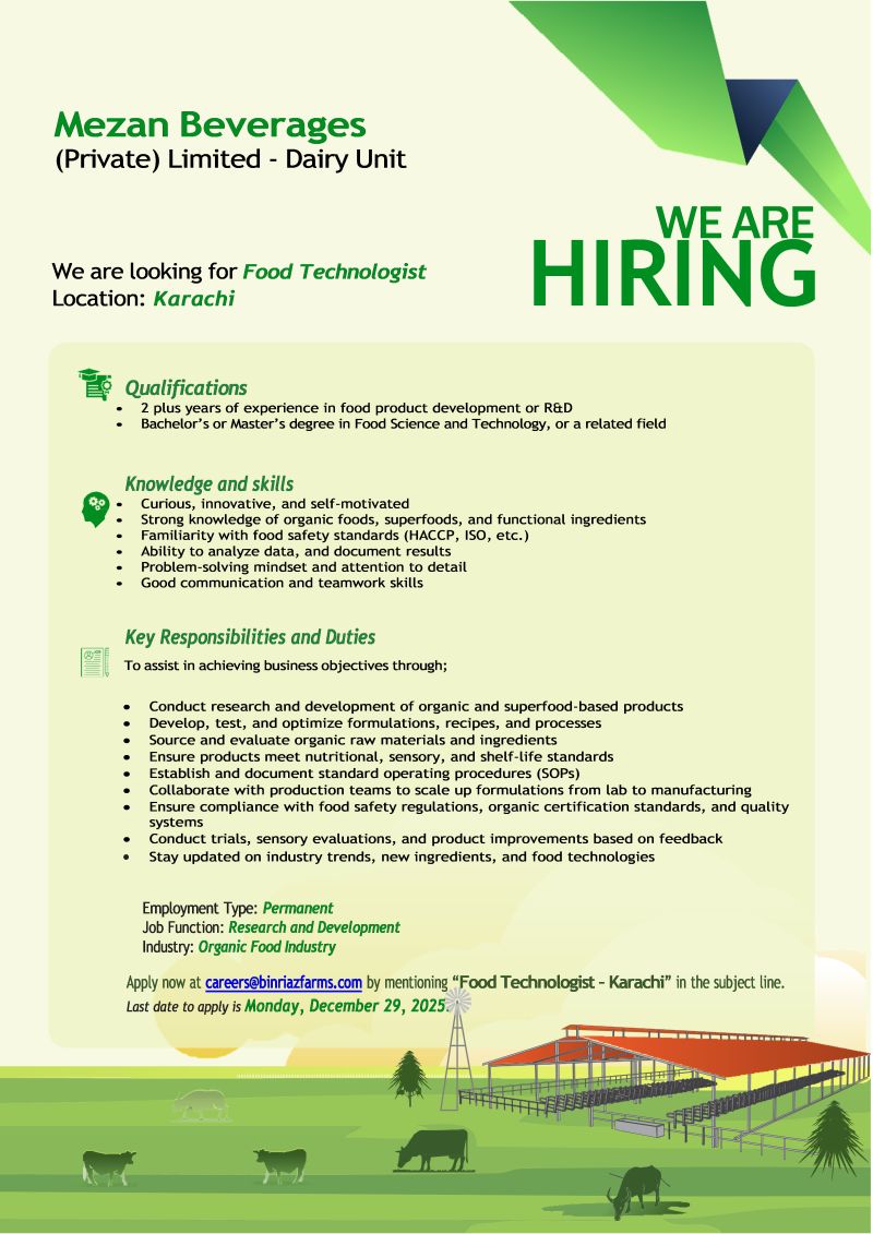 Apply now at [email protected] by mentioning “Food Technologist – Karachi” in the subject line. Last date to apply is Monday, December 29, 2025.