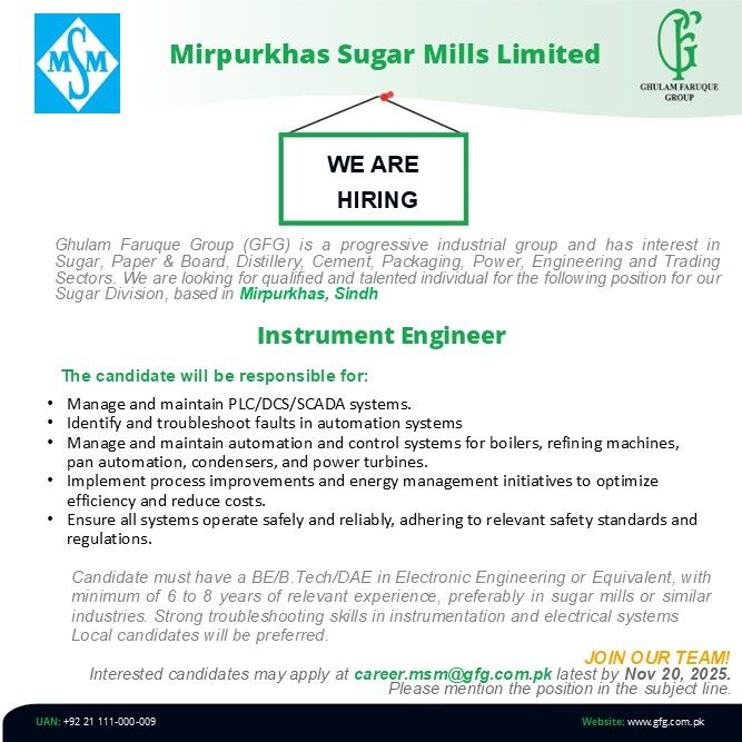 Mirpurkhas Sugar Mills Jobs Instrument Engineer: