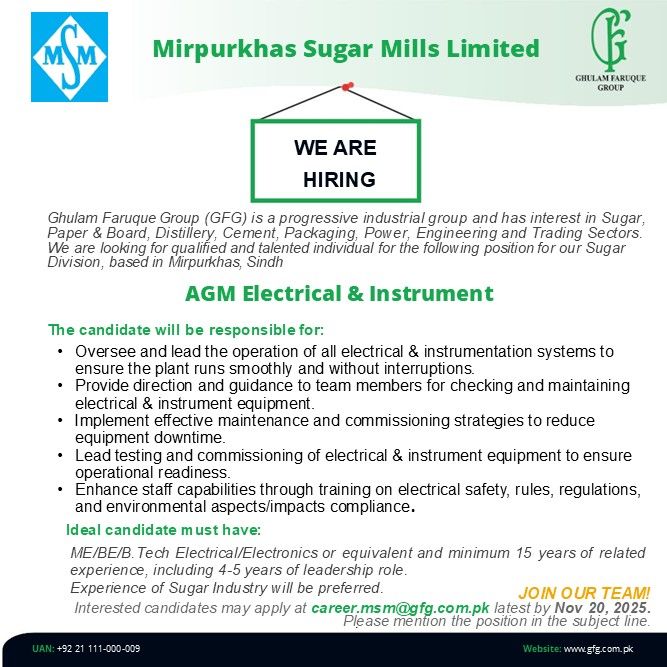 Mirpurkhas Sugar Mills Limited Jobs AGM Electrical & Instrument 1