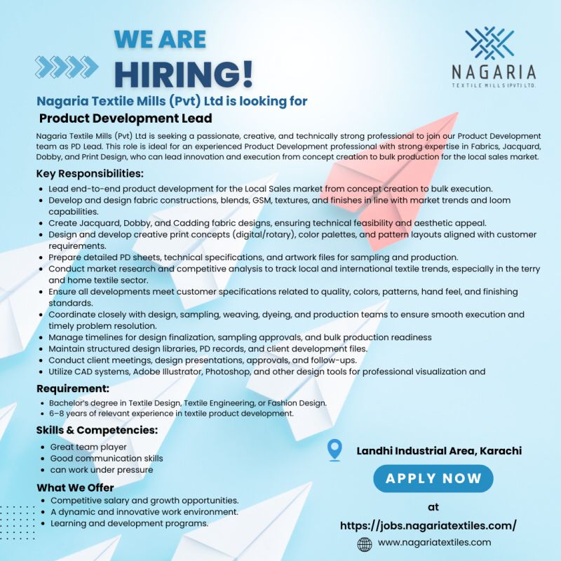 Nagaria Textile Mills (Pvt) Ltd Jobs Product Development Lead