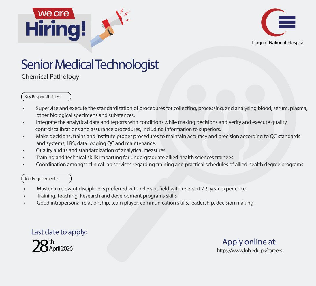 National Liaquat Hospital LNH Jobs Senior Medical Technologist