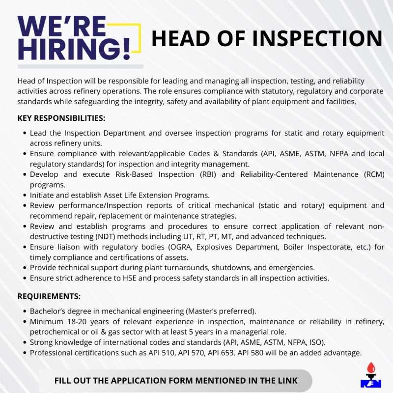 We are hiring a Head of Inspection — an exciting leadership opportunity for experienced professionals to oversee inspection, quality assurance, and compliance activities.