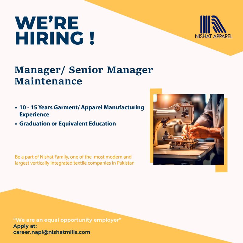 Nishat Apparel Pvt Ltd Jobs Manager / Senior Manager Maintenance:
