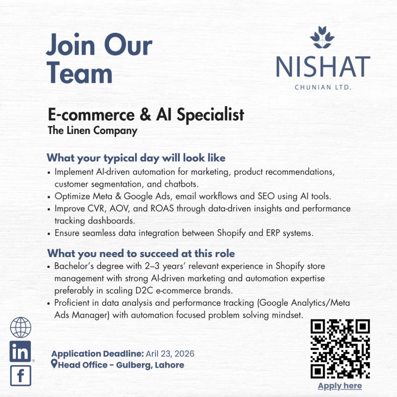 Join our team and shape the future of digital retail with one of Pakistan’s leading textile companies. We are looking for an E-commerce & AI Specialist to drive innovation, optimize performance, and elevate The Linen Company’s online experience.