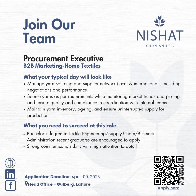 - Bachelor’s degree in Textile Engineering/Supply Chain/Business Administration, recent graduates are encouraged to apply