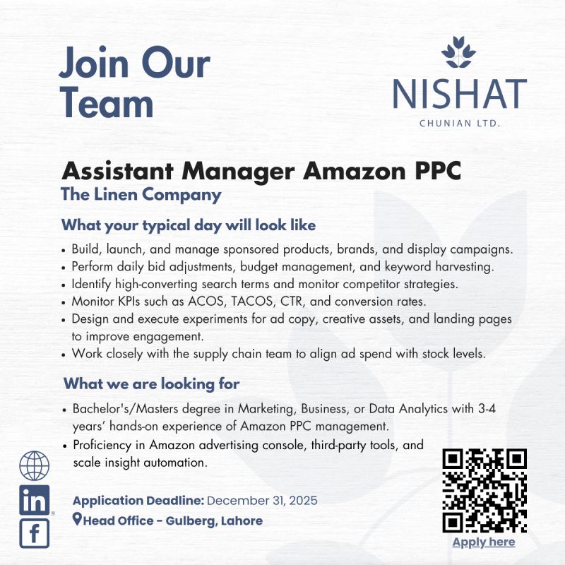 Nishat Chunian Ltd Jobs Assistant Manager Amazon PPC: