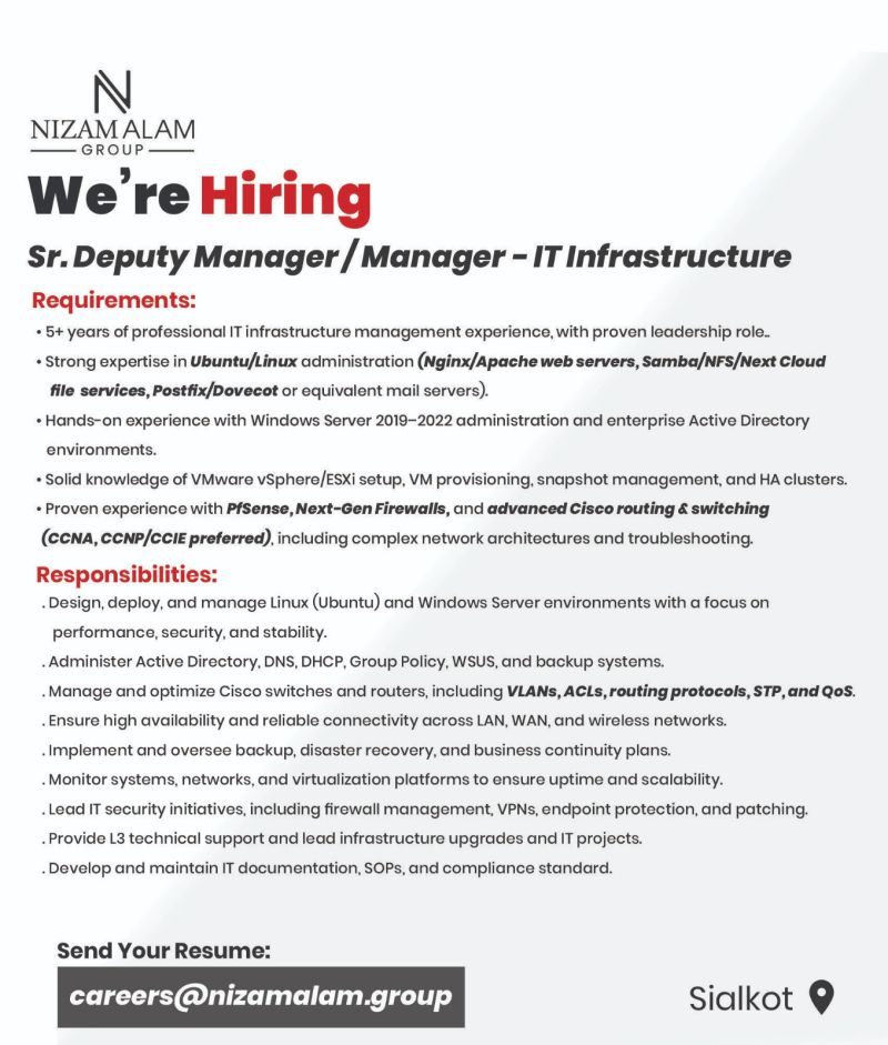 Nizam Alam Group Jobs Sr Deputy Manager / Manager IT Infrastructure: