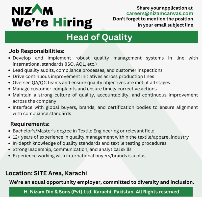 Nizam is looking for an experienced Head of Quality to lead quality systems, audits, and continuous improvement across our manufacturing operations.