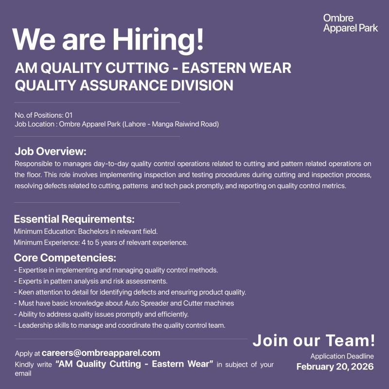 Apply at Ombre Apparel Park for the position of ‘AM Quality Cutting – Eastern Wear’ in our ‘Quality Assurance’ division by mentioning the position title in the subject of your email.