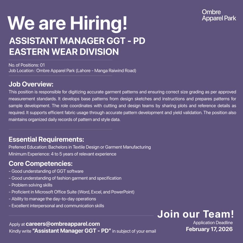 Apply at Ombre Apparel Park for the position of ‘AM GGT – PD’ in our ‘Eastern Wear’ division by mentioning the position title in the subject of your email.