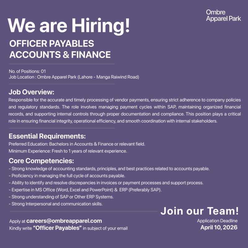 Apply at Ombre Apparel Park for the position of ‘Officer Payables’ in our ‘Accounts & Finance’ Department by mentioning the position title in the subject of your email.