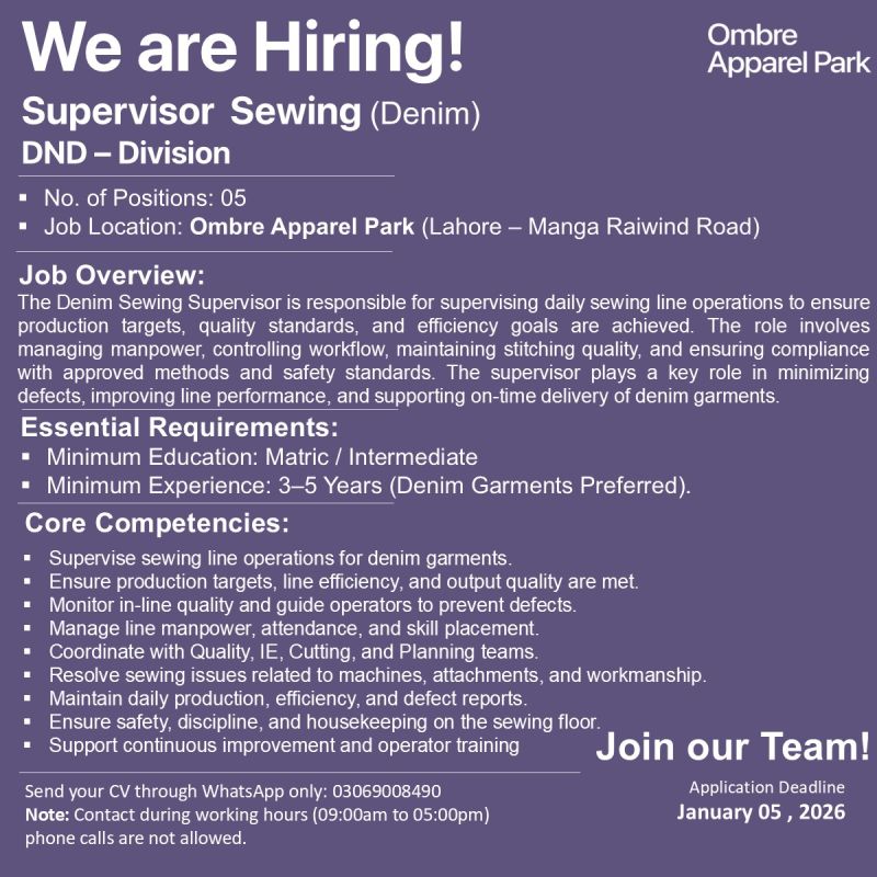 Ombre Apparel Park Jobs Supervisor Sewing (Denim) 1